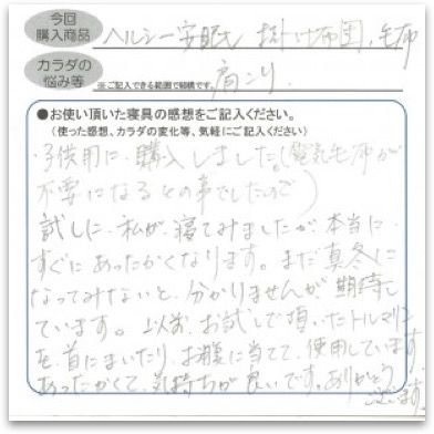 今までは、羊毛(30年使用)布団に夏用掛布団や毛布など、寝返りがうてない位、たくさん重ね掛け していたのですが、この温泉掛け布団を使用してからは、プラス毛布1枚で済むようになりました。 特に朝の目覚めが快適で、寒い冬の間でもすんなり布団から出られるようになりました。ありがとうございました。